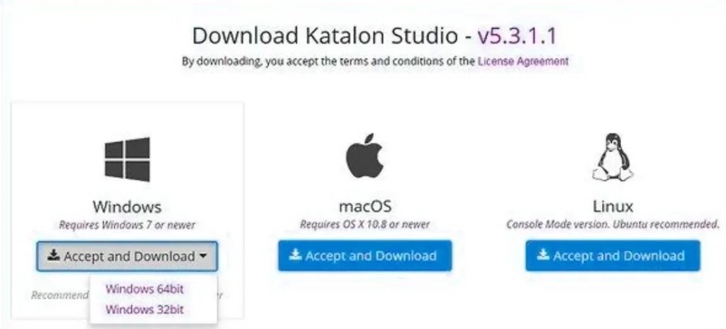 Krok#4. V okne „Download Katalon Studio“ (Stiahnuť Katalon Studio) vyberte operačný systém a kliknite na „Accept and Download“ (Prijať a stiahnuť).