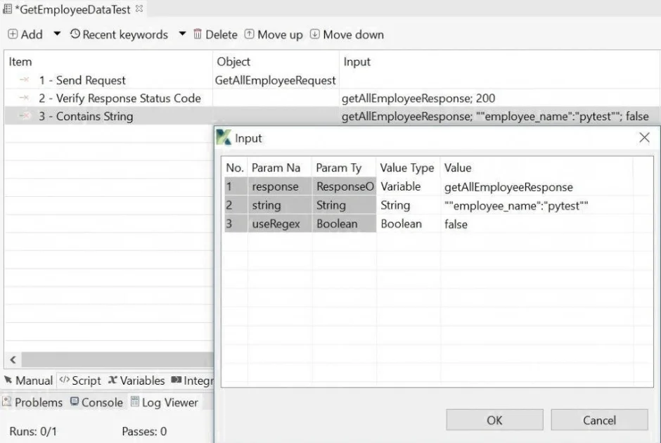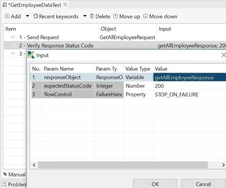 Verify Response Status Code (Overiť stavový kód odpovede) – toto kľúčové slovo sa používa na overenie stavu odpovede pri stlačení API. Nastavte vstupné pole, ako je uvedené nižšie.