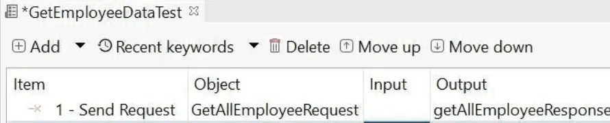 Send Request (Odoslať požiadavku) – kľúčové slovo Send Request sa používa na zasiahnutie rozhrania API, ktoré sme nastavili v adresári „Úložisko objektov“. V poli „Object“ bude názov API, t. j. „GetEmployeeDataTest“. Taktiež musíme uložiť výstup do premennej nastavením poľa ‚Output‘ s názvom premennej. Tá istá premenná sa bude používať v nasledujúcich kľúčových slovách.