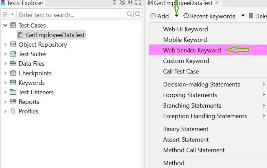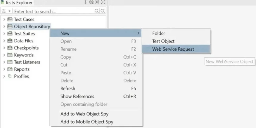 - Teraz kliknite pravým tlačidlom myši na ikonu adresára „Object Repository“ a kliknite na „New“ -> „Web Service Request“ (Žiadosť o webovú službu).