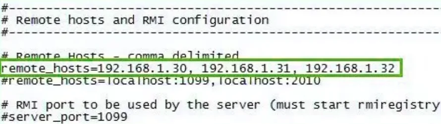 - Teraz v hlavnom systéme otvorte súbor vlastností jmeter.properties a upravte položku remote_hosts. Odstráňte hodnotu loopback adresy (127.0.0.1) pre položku remote_host a zadajte IP adresy všetkých podriadených systémov oddelené čiarkami.