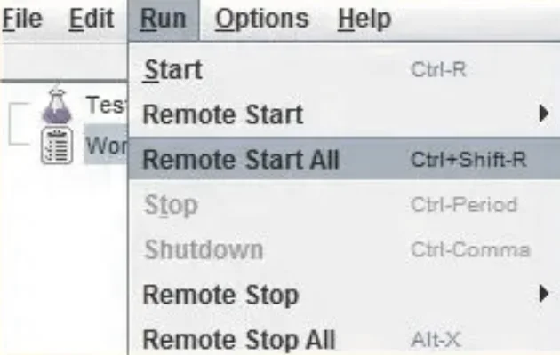 - Potrebujeme len vzdialene spustiť všetky podriadené počítače v aplikácii JMeter. Na tento účel stačí otvoriť JMeter na hlavnom počítači (pre ktorý je práve upravený súbor vlastností). Otvorte svoj testovací skript a vzdialene spustite všetky uzly.