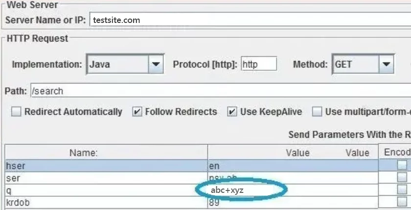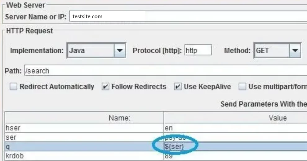 - Najprv je potrebné vykonať záznam scenára, pre ktorý je potrebná parametrizácia, napr. testovanie zaťaženia funkcie vyhľadávania. Potom musíme identifikovať požiadavku alebo volanie, ktoré je spojené s vyhľadávacou akciou. Jednoduchým spôsobom, ako nájsť konkrétnu požiadavku, je nájsť vyhľadávací výraz, ktorý sme použili počas nahrávania. Napríklad ak sme nahrávali s vyhľadávacím výrazom – „abc“, potom by sme mali nájsť pole, ktoré má ako hodnotu „abc“.