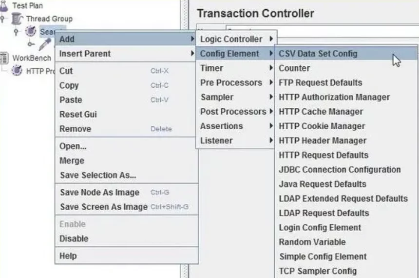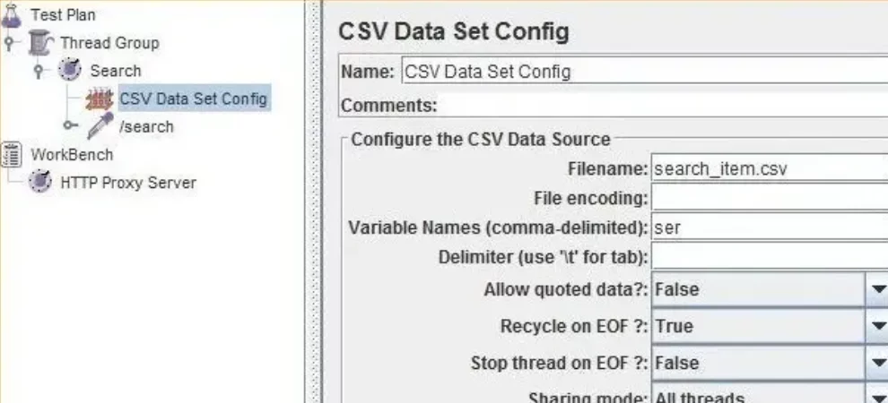 - Teraz prejdite do JMeter a umiestnite kontrolér (logistic controller) „CSV Data Set Config“ kdekoľvek pred požiadavku, ktoré má parameter search action (pozri obrázok nižšie). Ďalej musíme nakonfigurovať ovládací prvok „CSV Data Set Config“. Do textového poľa Názov súboru – zadajte názov súboru CSV spolu s celou cestou. Ak sa súbor CSV nachádza v tom istom adresári, v ktorom sa nachádza skript JMeter, cestu možno vynechať. Do textového poľa Názov premennej – zadajte akýkoľvek platný názov premennej.