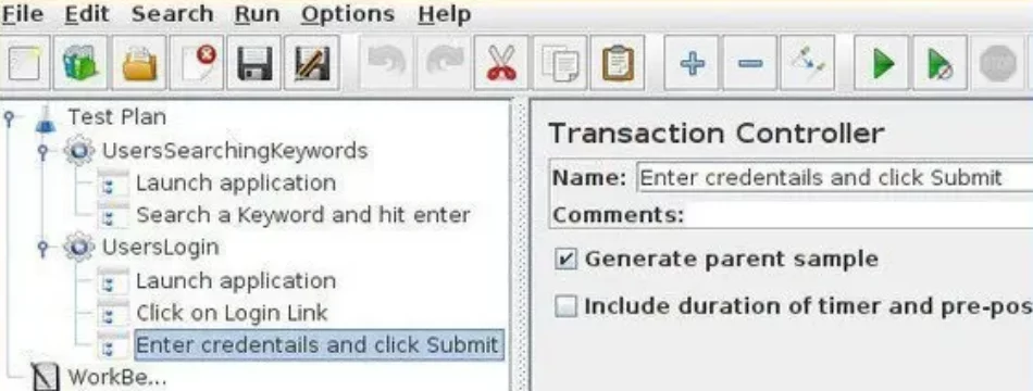 - Pridajte viacero kontrolérov transakcií ako potomkov tejto skupiny Thread Group a pomenujte ich podľa operácií, ktoré vykonávajú, napríklad – „Spustenie aplikácie“, „Vyhľadanie kľúčového slova a stlačenie klávesu enter“, „Zatvorenie aplikácie“.
