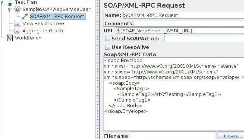 Sampler „SOAP/XML-RPC Request“ sa používa na odoslanie požiadavky SOAP alebo XML-RPC webovej službe. Tento sampler vytvorí požiadavku HTTP POST(keďže SOAP je založený na metóde POST) s telom požiadavky zadaným v poli „SOAP/XML-RPC Data“. Po začiarknutí políčka Send SOAPAction (Odoslať akciu SOAP) môžeme v poli SOAPAction (Akcia SOAP) zadať akciu SOAP.