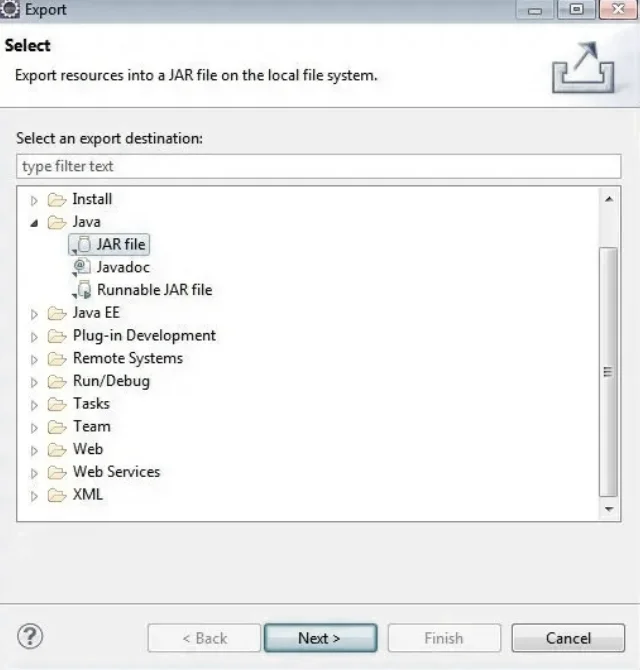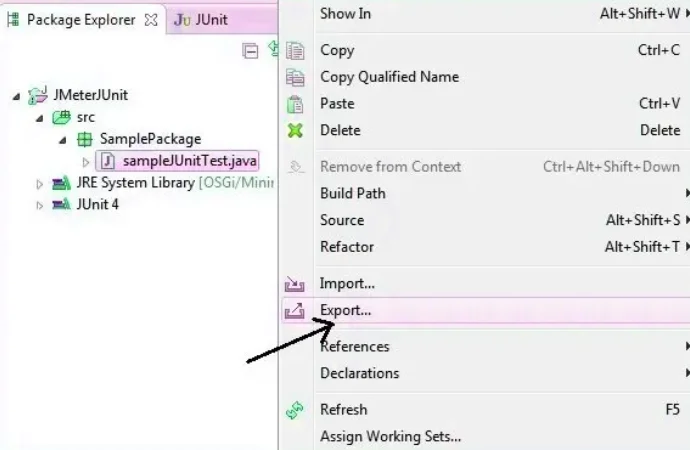 Teraz vytvoríme Jar vyššie uvedeného projektu JUnit. V aplikácii eclipse možno jar vytvoriť jednoducho pomocou funkcie Export. Postupujte podľa nižšie uvedených snímok obrazovky, aby ste vytvorili Jar: